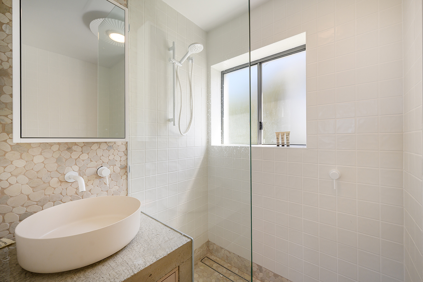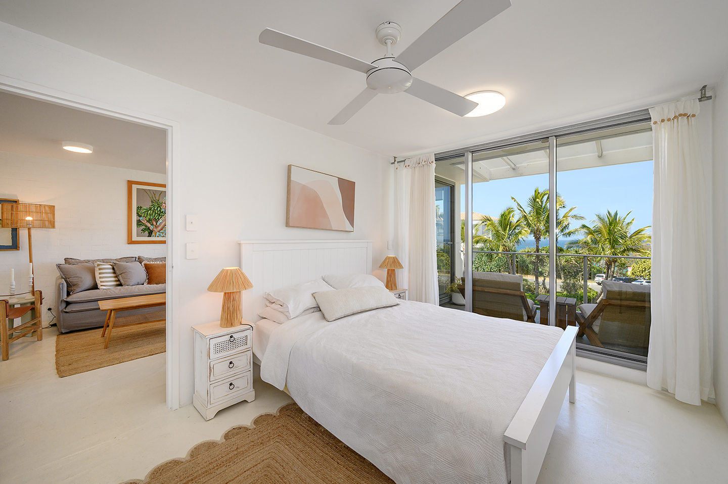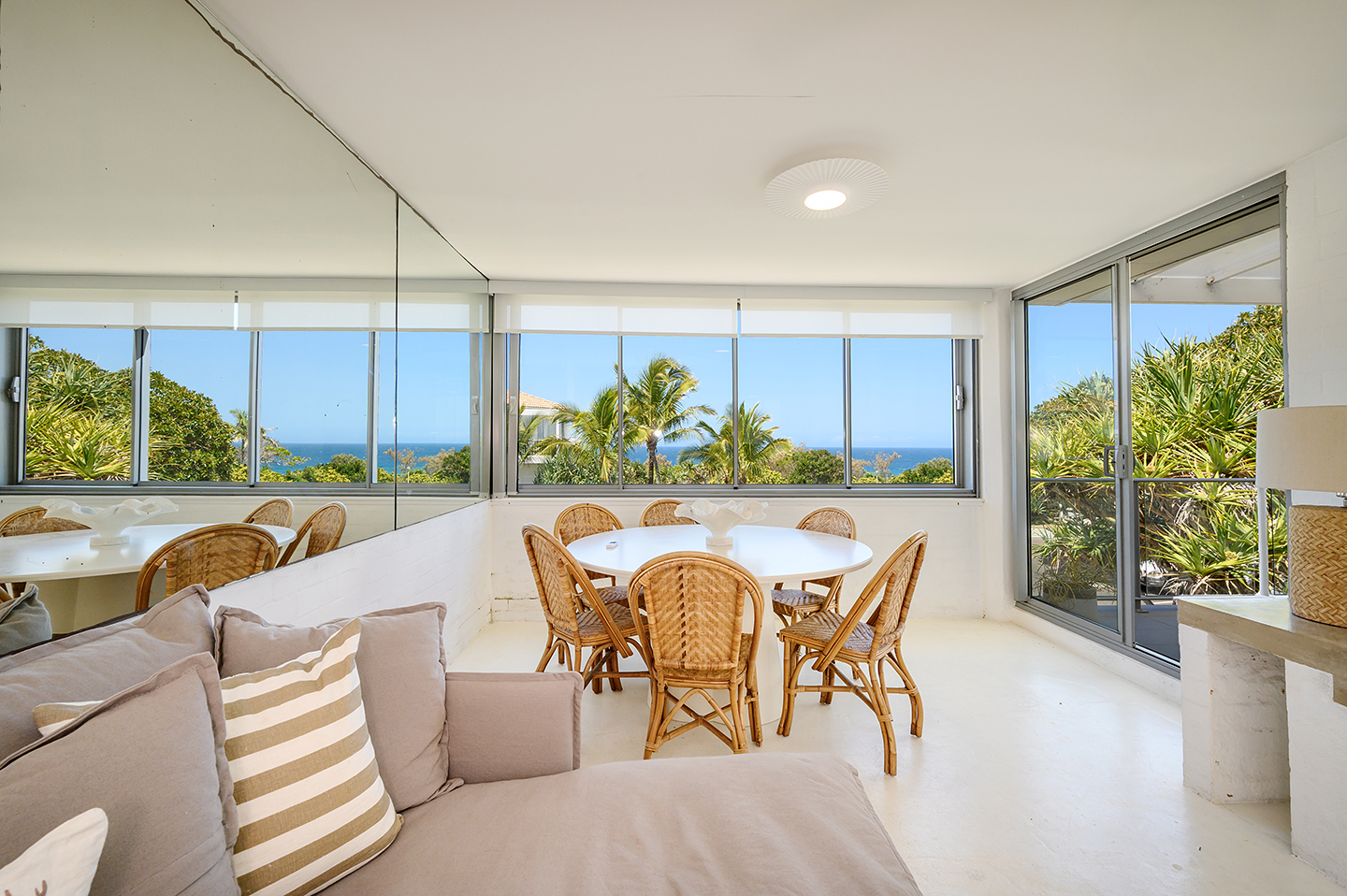 Recently renovated, this space has been styled for a sense of serenity. It’s a fitting canvas for the panorama of the gleaming ocean, blue skies, and swaying coastal palms.