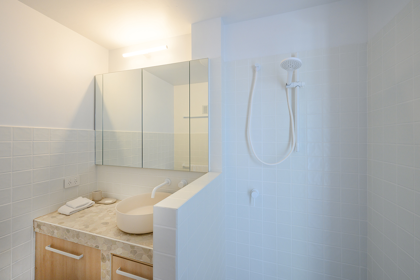 The master bedroom stakes its claim at the front of the property. With direct access to the balcony, you fall asleep to the soothing sounds of the ocean and wake up to the sun rising over the water. This master suite is complete with a queen bed, vibrant ensuite, and dual wardrobes.