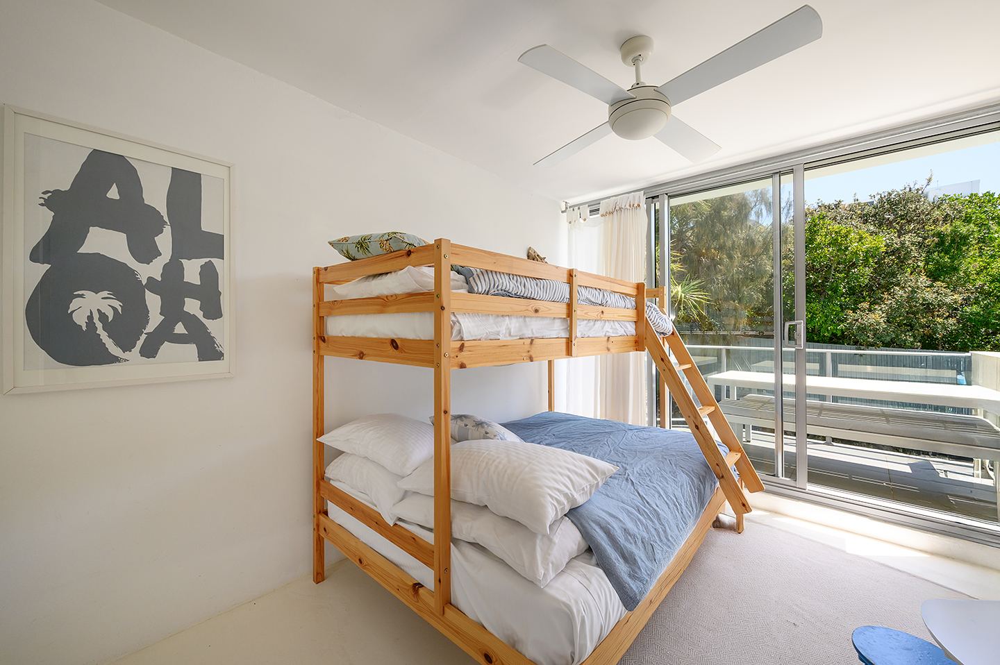 Two additional bedrooms are positioned at the back of the penthouse, opening onto a spacious joint balcony that overlooks the swimming pool. Bathed in sunlight, bedroom 2 has a double bunk bed, sleeping up to three guests – perfect for a kid’s retreat. Bedroom 3 offers plenty of space and a queen bed for two guests. A shared main bathroom is positioned adjacent and incorporates the laundry.